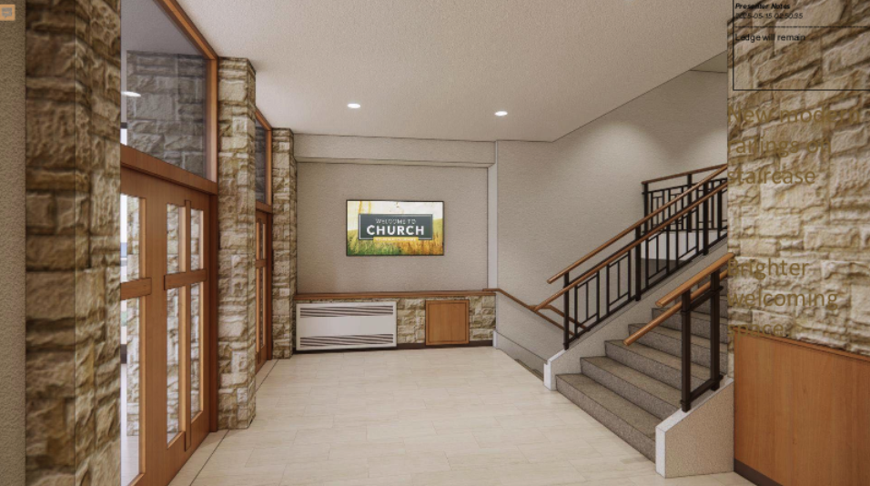 The renovation project at Our Savior is designed to strengthen both the beauty and the usefulness of God’s house. On the exterior, plans include improving the main entryway to provide a more welcoming entrance for members and visitors, and the addition of a prominent bell tower—a visible witness in our community and a reminder of the call to gather around Word and Sacrament.